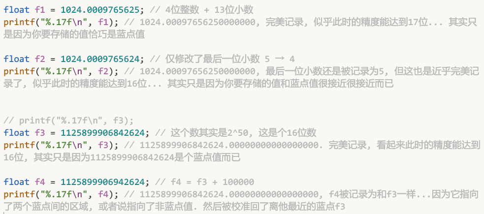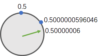 而0 ~ 0.5之间, 间隔则会更小, 精度则会更高 (因为浮点数表盘上的蓝点是越来越稀疏, 精度越来越差的. 如果靠后的0.5 ~ 1范围中能精确到小数点后7位, 那更靠前的0 ~ 0.5中只会更精确, 或者说蓝点只会更密集, 间隔只会更小)
