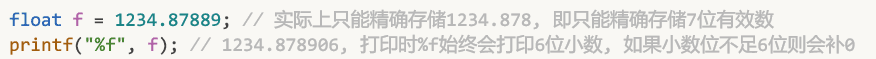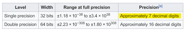 如wiki中所说, 32位浮点数的精度大约是7位十进制数, 64位浮点数的大约是16位十进制数.