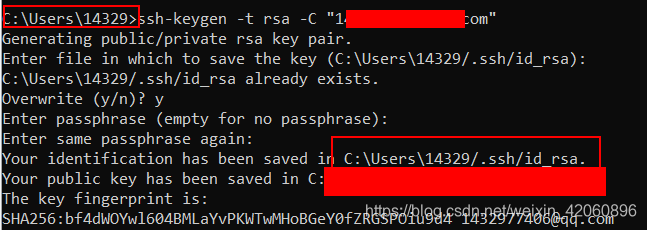 - 创建公钥,ssh-keygen -t rsa -C "xxx@xxx.com"(注册的邮箱帐号)选择都选y