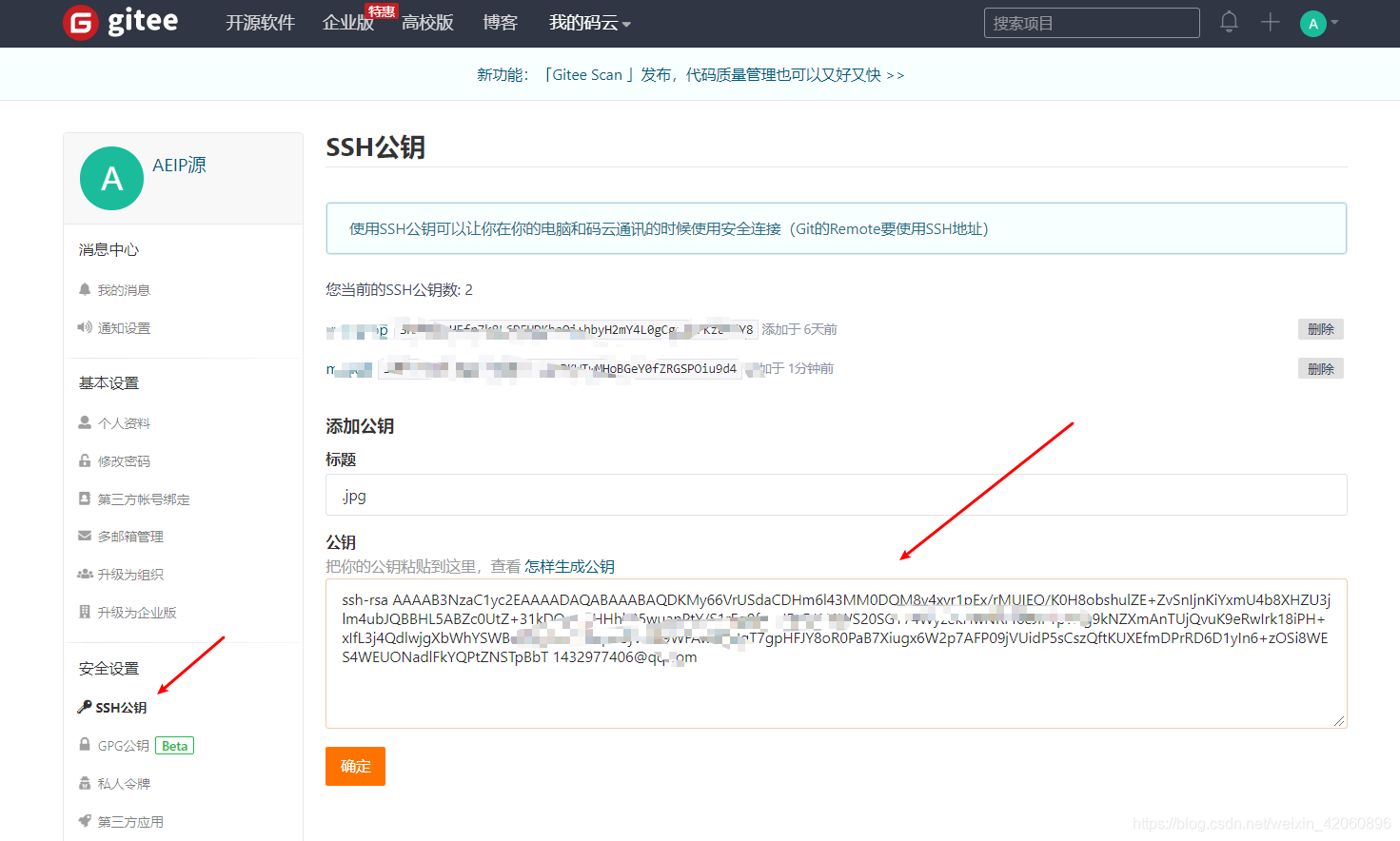 - 打开id_rsa.pub文件,复制文件中的所有代码,点击码云中的 设置->SSH公钥,将生成的公钥复制到公钥中