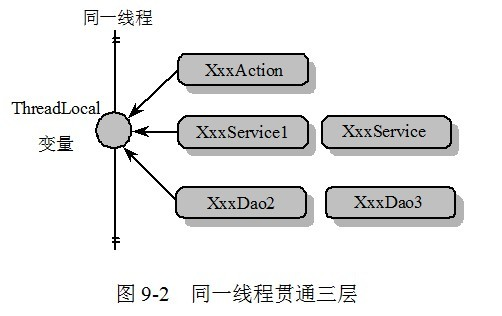当然,这个例子本身很粗糙,将Connection的ThreadLocal直接放在Dao只能做到本Dao的多个方法共享Connection时不发生线程安全问题,但无法和其他Dao共用同一个Connection,要做到同一事务多Dao共享同一个Connection,必须在一个共同的外部类使用ThreadLocal保存Connection。但这个实例基本上说明了Spring对有状态类线程安全化的解决思路。在本章后面的内容中,我们将详细说明Spring如何通过ThreadLocal解决事务管理的问题。