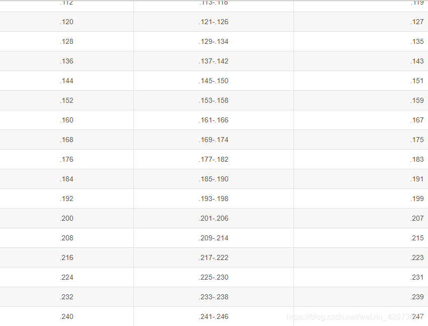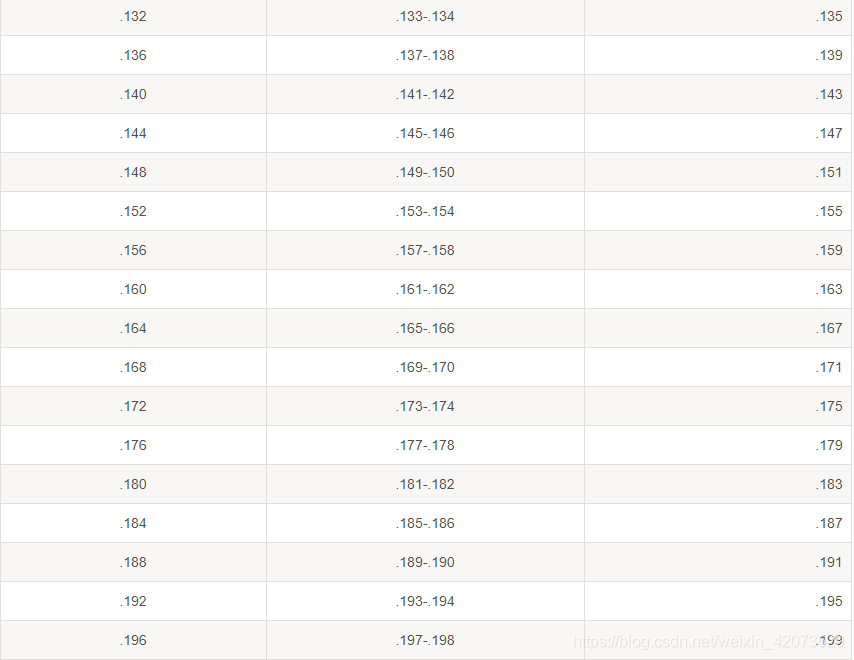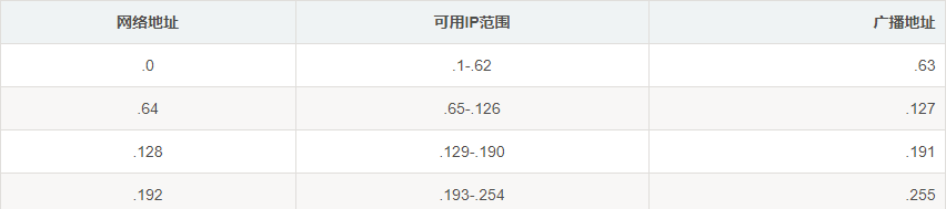 不管平均划分成几个子网,计算得到相应的节点之后便能划分出子网的地址空间,需要注意的是,每两个节点之间都是等间隔的,也就是说最后一段不一定是到255,而是根据间隔大小推算的,比如本题的网络前缀如果换成25,则答案变为: