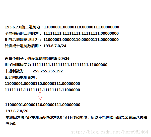 解析:默认广播地址和默认网关地址可以一起记,因为默认广播地址就是主机位全为1,假如本题的网络前缀变成26,默认广播地址为193.6.7.00 111111 =》193.6.7.63/26