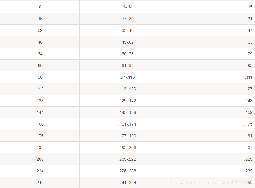 16-30位网络号-掩码位数,IP总数,子网掩码查询表
