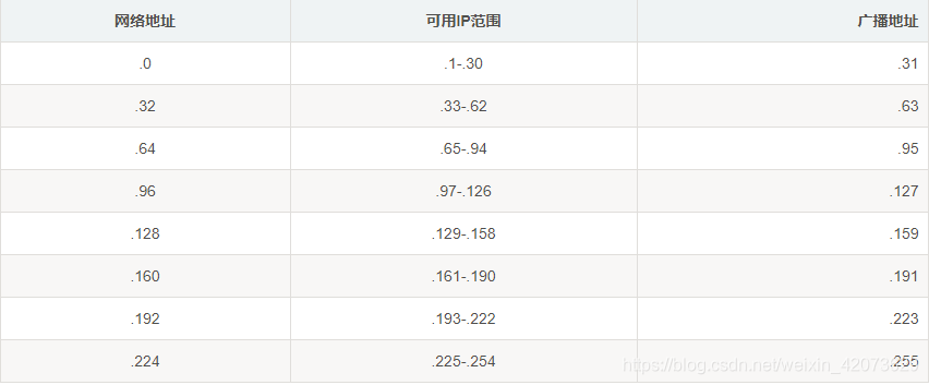 27位网络号,5位主机号,可形成8个子网,每个子网30台主机