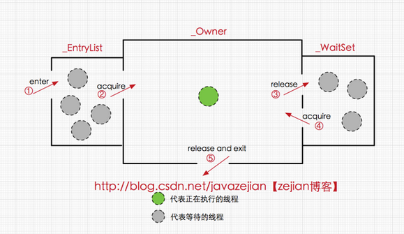 ObjectMonitor中有两个队列,_WaitSet 和 _EntryList,用来保存ObjectWaiter对象列表( 每个等待锁的线程都会被封装成ObjectWaiter对象),_owner指向持有ObjectMonitor对象的线程,当多个线程同时访问一段同步代码时,首先会进入 _EntryList 集合,当线程获取到对象的monitor 后进入 _Owner 区域并把monitor中的owner变量设置为当前线程同时monitor中的计数器count加1,若线程调用 wait() 方法,将释放当前持有的monitor,owner变量恢复为null,count自减1,同时该线程进入 WaitSe t集合中等待被唤醒。若当前线程执行完毕也将释放monitor(锁)并复位变量的值,以便其他线程进入获取monitor(锁)。如下图所示