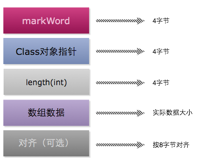 关于对象的内存结构,需要注意数组的内存结构和普通对象的内存结构稍微不同,因为数据有一个长度length字段,所以在对象头后面还多了一个int类型的length字段,占4个字节,接下来才是数组中的数据,如下图: