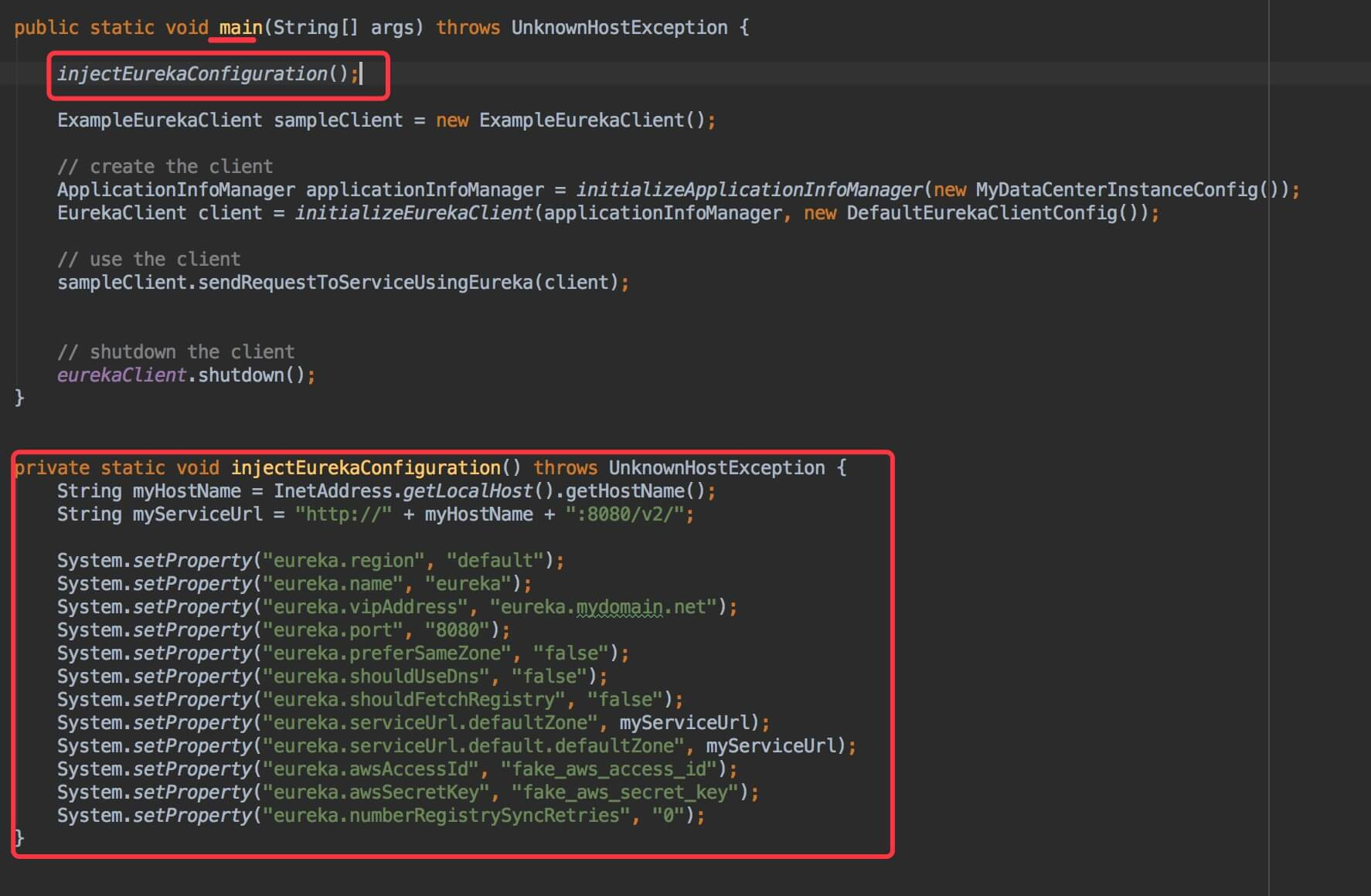 第四步,在 ExampleEurekaClient#main() 方法的第一行,添加 injectEurekaConfiguration() 代码。