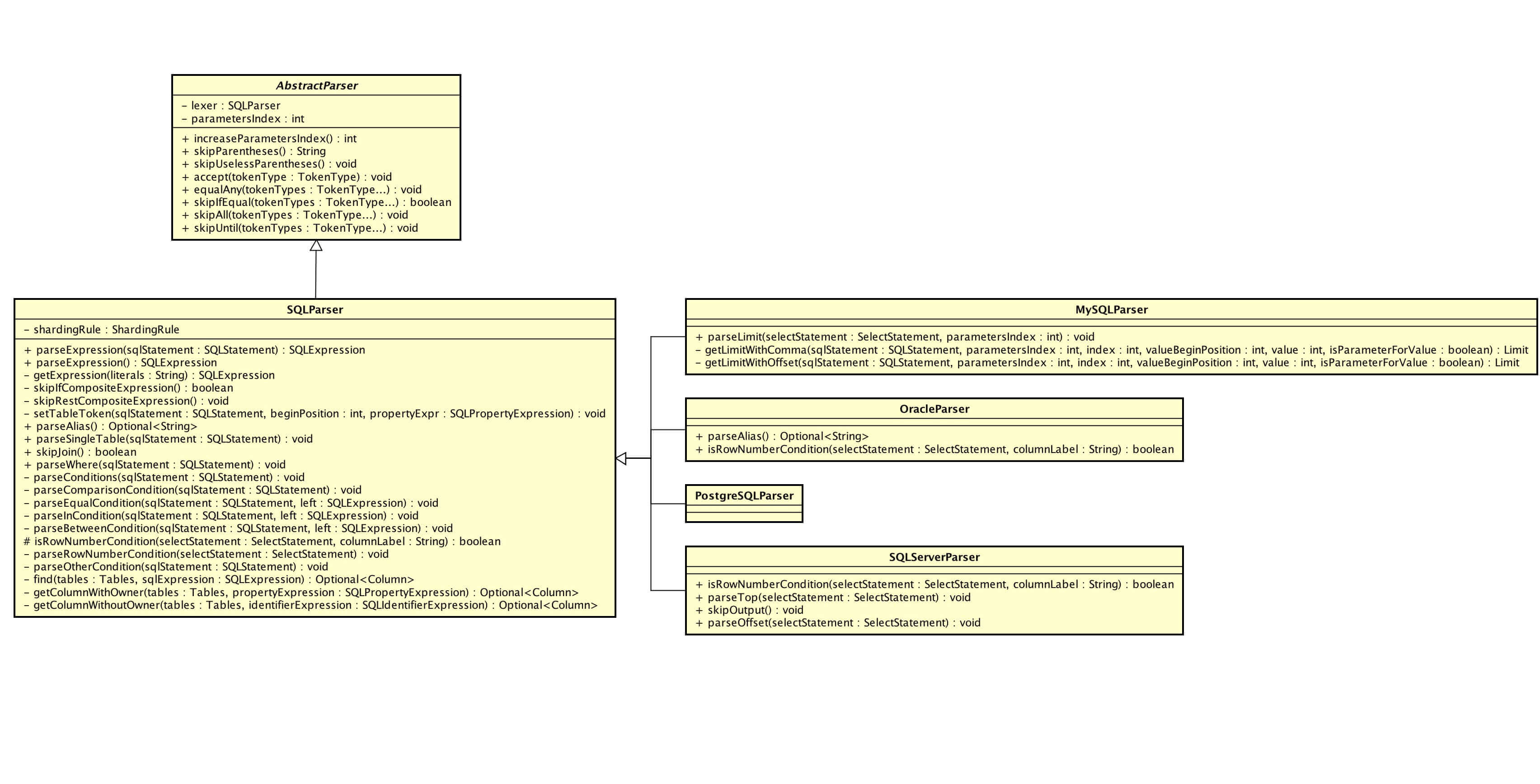 SQLParser,SQL 解析器,主要提供只考虑 SQL 块的解析方法,不考虑 SQL 上下文。下文即将提到的 StatementParser 将 SQL 拆成对应的块,调用 SQLParser 进行解析。🤓 这么说,可能会有些抽象,我们下面来一起看。