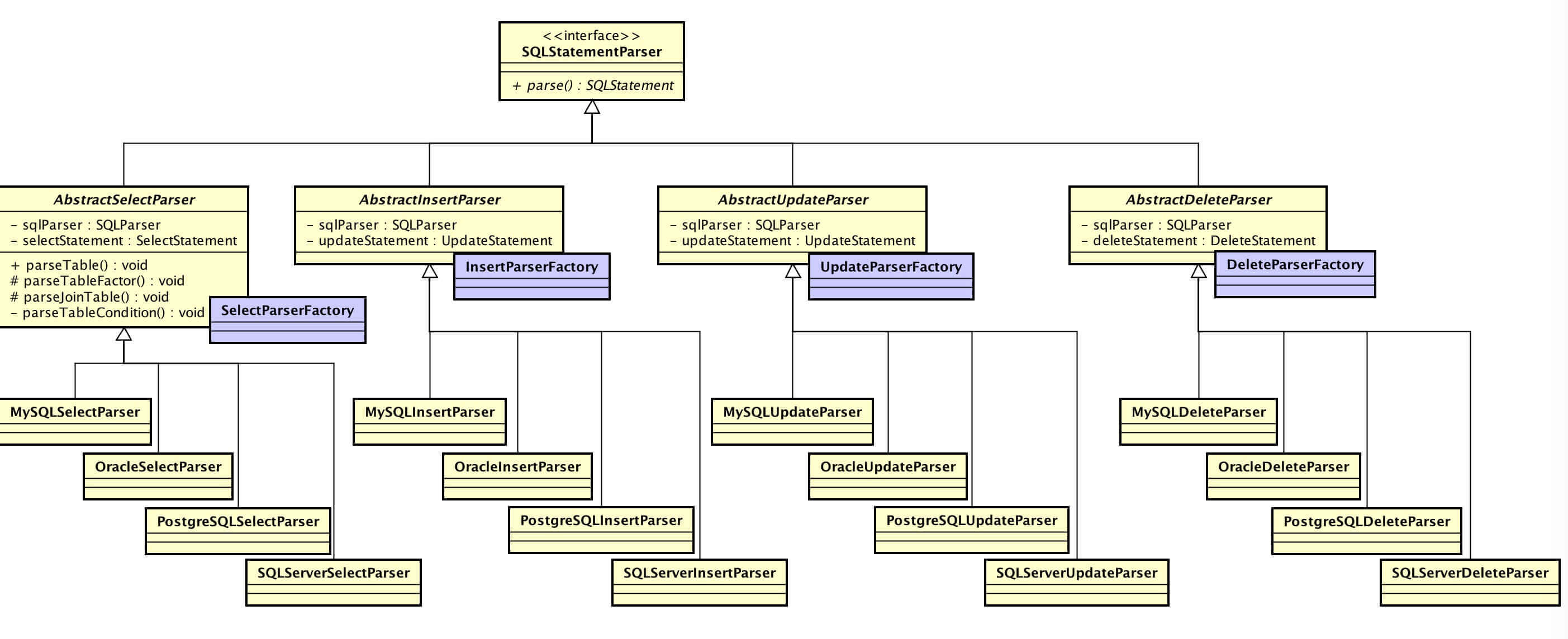 StatementParser,SQL语句解析器。每种 SQL,都有相应的 SQL语句解析器实现。不同数据库,继承这些 SQL语句解析器,实现各自 SQL 上的差异。大体结构如下: