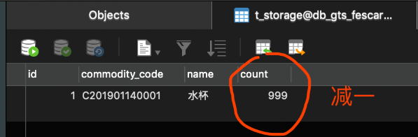 t_storage表,库存减一。如下图: