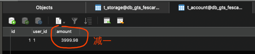 t_account表,余额减一。如下图: