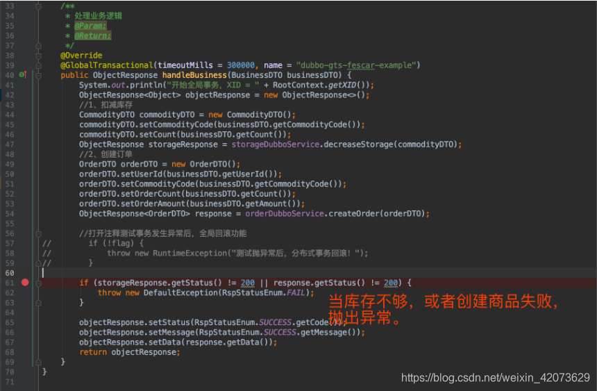 "commodityCode"写错成了"C201901140001xxxx",用于模拟分布式事务,因为库存不足,进行回滚。 - 为了更好的看过过程中的变化,我们在 BusinessServiceImpl 类的