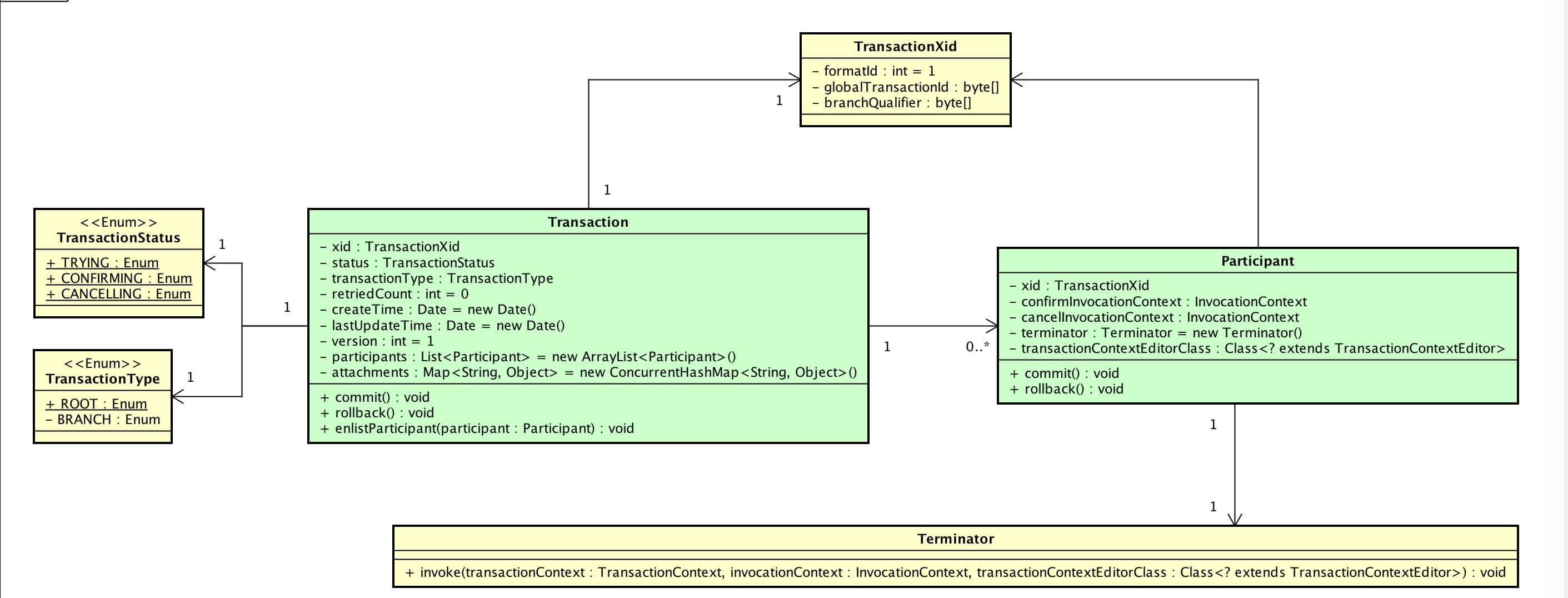 在 TCC 里,一个事务( org.mengyun.tcctransaction.Transaction ) 可以有多个参与者( org.mengyun.tcctransaction.Participant )参与业务活动。类图关系如下( 打开大图 ):