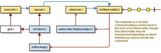 如果hystrix命令执行成功,它将会返回一个Observable,根据调用的方法,Observable将会被转换成响应结果:
