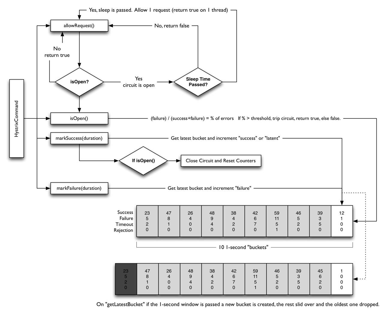 下面的图表展示了HystrixCommand和HystrixObservableCommand与HystrixCircuitBreaker交互的流程,以及HystrixCircuitBreaker的原理。
