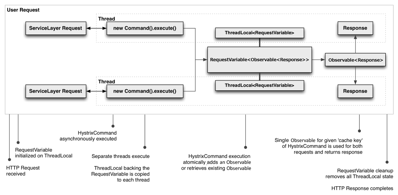 HystrixCommand和HystrixObservableCommand实现了缓存机制,通过指定一个cache key,它们能够在一个请求范围内对运行结果进行缓存以便下次使用。下面是在一个请求中两个线程执行同一个请求的流程: