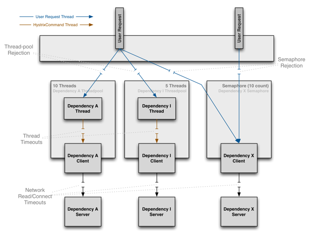 也可以使用信号量来限制每个依赖的并发数量。他可以对依赖服务降级,但不能监听timeout,如果我们对依赖服务的调用确认不会出现timeout情况,我们也可以使用这中方式。