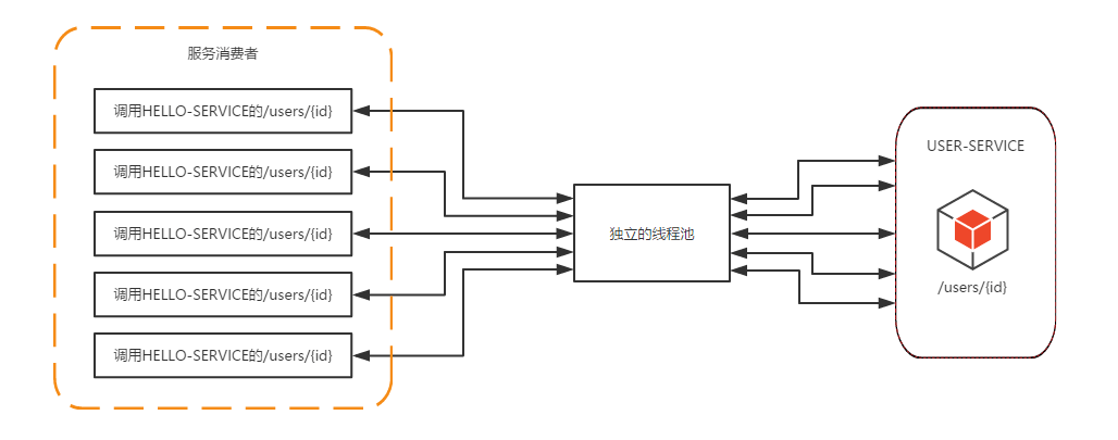 下图展示了在未使用HystrixCollapser请求合并器之前的线程使用情况。可以看到当服务消费者同时对USER-SERVICE的/users/{id}接口发起了五个请求时,会向该依赖服务的独立线程池中申请五个线程来完成各自的请求操作。
