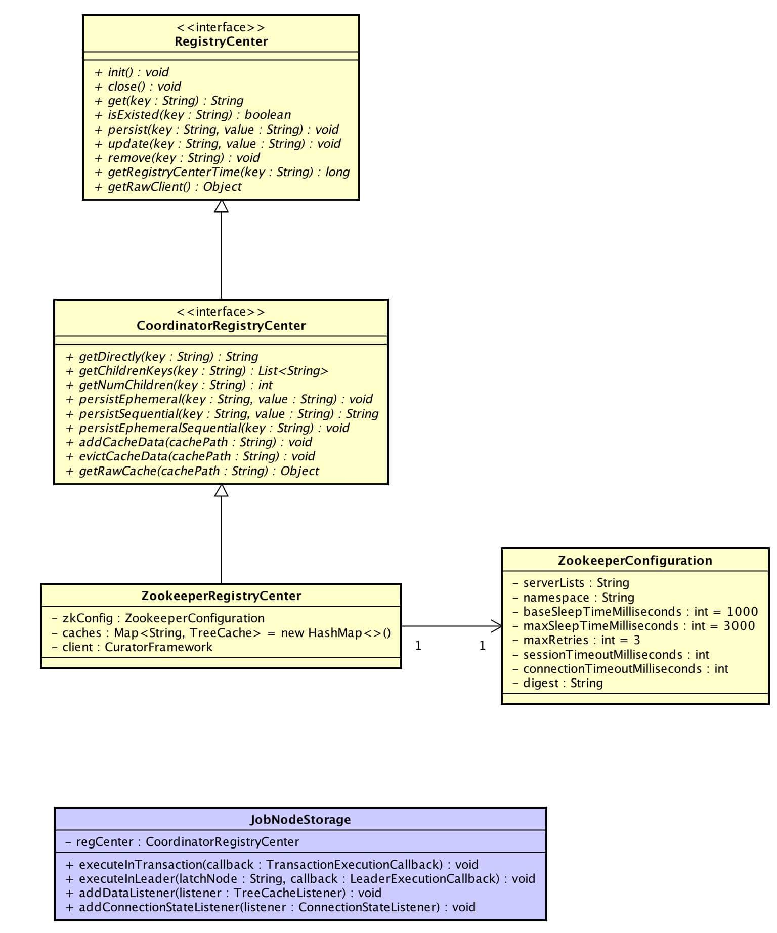 ZookeeperRegistryCenter,基于 Zookeeper 注册中心。从上面的类图可以看到,ZookeeperRegistryCenter 实现 CoordinatorRegistryCenter 接口,CoordinatorRegistryCenter 继承 RegistryCenter 接口。