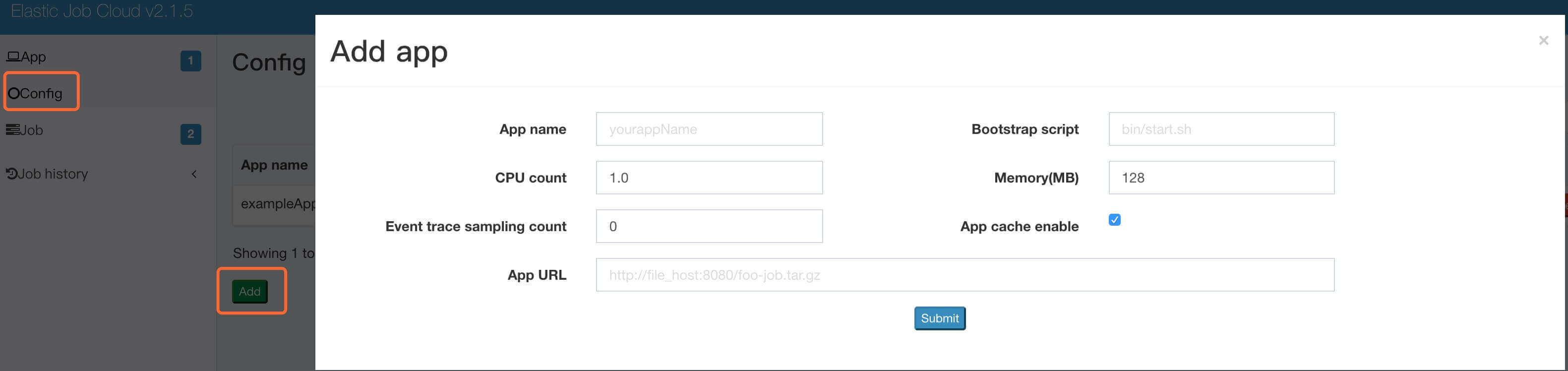 curl -l -H "Content-type: application/json" -X POST -d '{"appName":"foo_app","appURL":"http://app_host:8080/yourJobs.gz","cpuCount":0.1,"memoryMB":64.0,"bootstrapScript":"bin/start.sh","appCacheEnable":true,"eventTraceSamplingCount":0}' http://elastic_job_cloud_host:8899/api/app