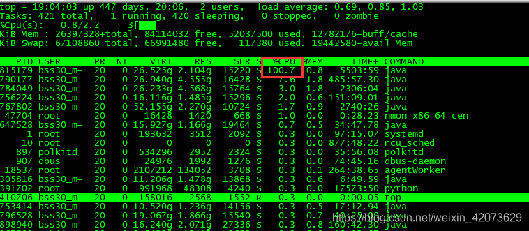 m TIME+ 进程使用的CPU时间总计,单位1/100秒