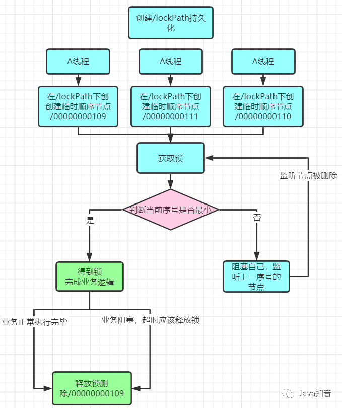 第一种方案实现较为简单,逻辑就是谁创建成功该节点,谁就持有锁,创建失败的自己进行阻塞,A线程先持有锁,B线程获取失败就会阻塞,同时对/lockPath设置监听,A线程执行完操作后删除节点,触发监听器,B线程此时解除阻塞,重新去获取锁。
