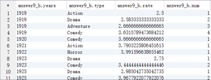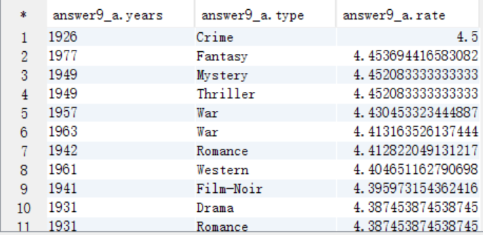 (9)各年评分最高的电影类型(年份,类型,影评分)