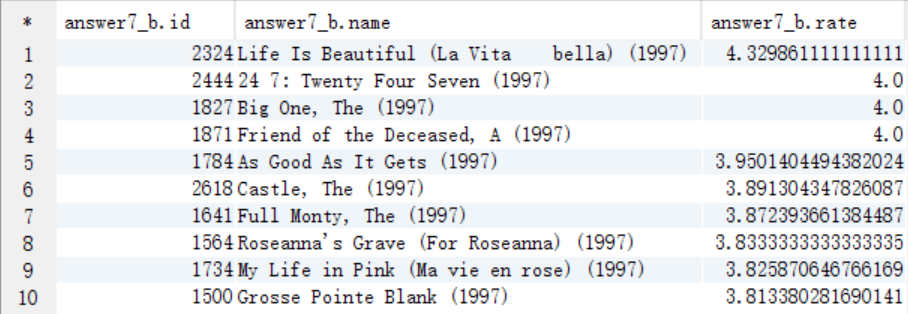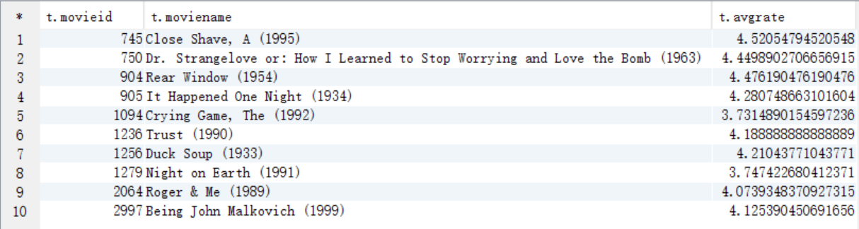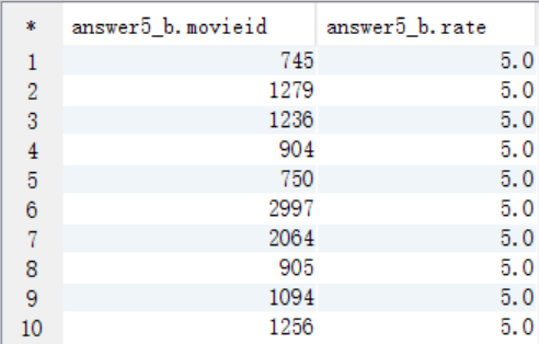 (5)求最喜欢看电影(影评次数最多)的那位女性评最高分的10部电影的平均影评分(观影者,电影名,影评分)