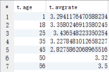 (4)求movieid = 2116这部电影各年龄段(因为年龄就只有7个,就按这个7个分就好了)的平均影评(年龄段,影评分)