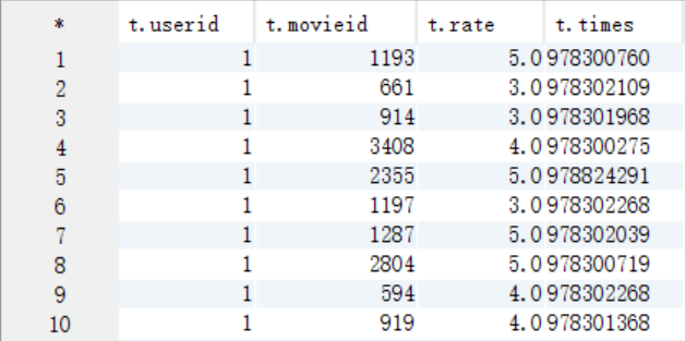 t_rating:userid bigint,movieid bigint,rate double,times string