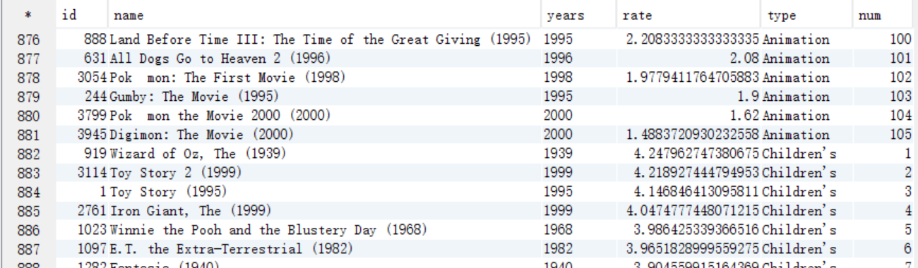 (8)该影评库中各种类型电影中评价最高的5部电影(类型,电影名,平均影评分)