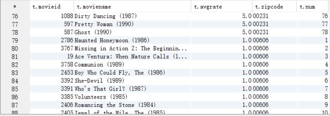 (10)每个地区最高评分的电影名,把结果存入HDFS(地区,电影名,影评分)