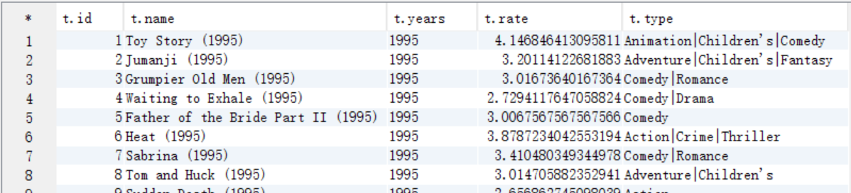 需要创建一个数据库movie,在movie数据库中创建3张表,t_user,t_movie,t_rating