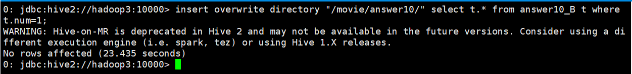 0: jdbc:hive2://hadoop3:10000> load data local inpath "/home/hadoop/movie/movies.dat" into table t_movie;