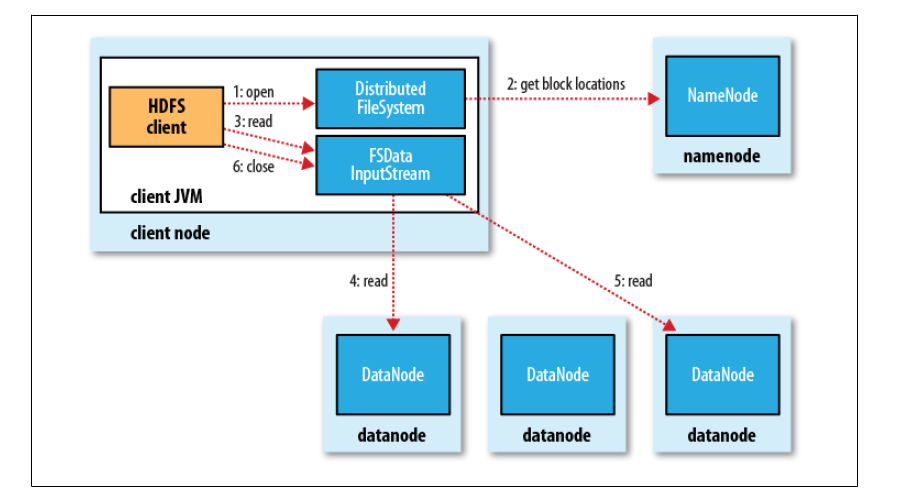 3、获得输入流之后,客户端调用read 方法读取数据。选择最近的DataNode 建立连接并读取数据。