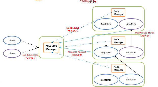 从YARN的架构图来看,它主要由ResourceManager、NodeManager、ApplicationMaster和Container等以下几个组件构成。