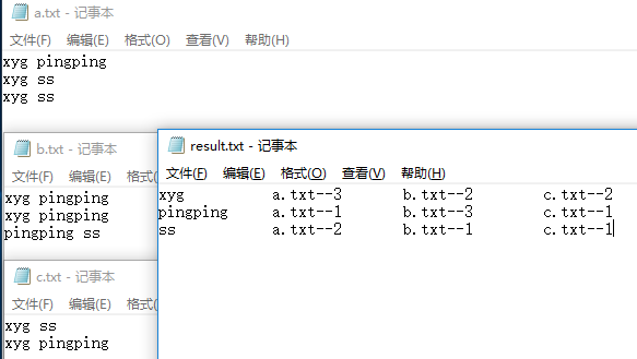 xyg c.txt-->2 b.txt-->2 a.txt-->3