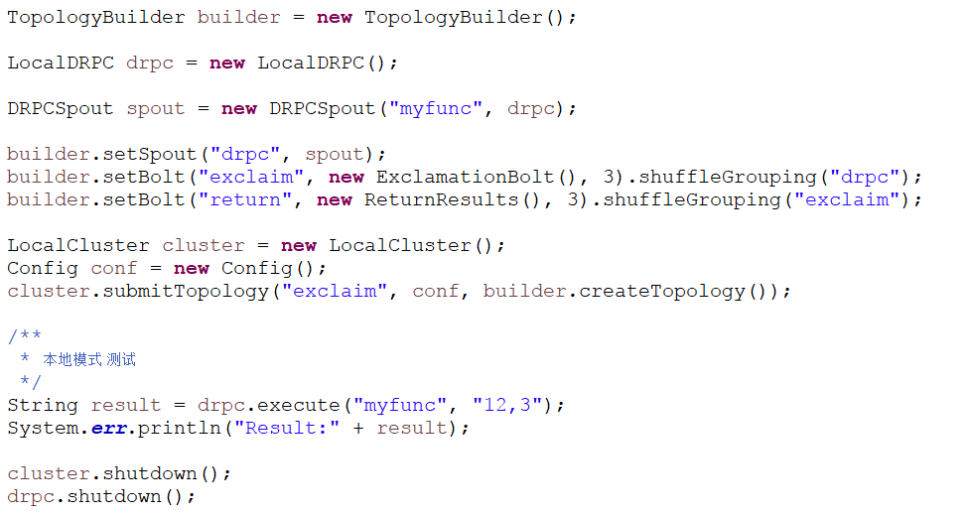 方法2: 直接通过普通的拓扑构造方法TopologyBuilder来创建DRPC拓扑 需要手动设定好开始的DRPCSpout以及结束的ReturnResults
