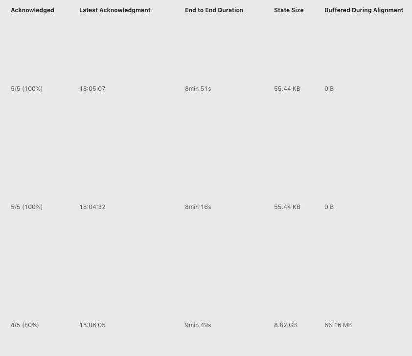 - 其中 Acknowledged 一列表示有多少个 subtask 对这个 Checkpoint 进行了 ack,从图中我们可以知道第三个 operator 总共有 5 个 subtask,但是只有 4 个进行了 ack;