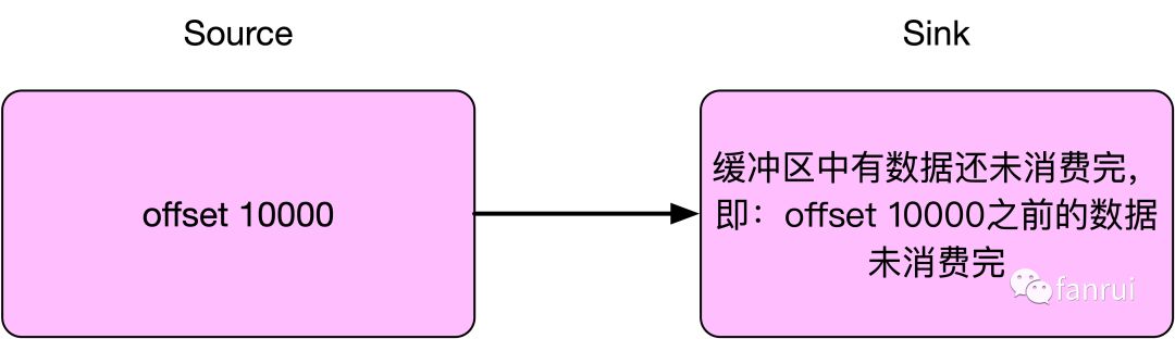 例如,Flink 任务消费的 Kafka 数据,当 Checkpoint 时,Flink 任务消费到 offset 为 10000 的位置,但实际上 offset 10000 之前的一小部分数据可能还在数据缓冲队列中还未完全消费,或者因为没积攒够一定批次所以数据缓存在 client 中,并未请求到第三方。当任务失败后,Flink 任务从 Checkpoint 处恢复,会从 offset 为 10000 的位置开始消费,此时 offset 10000 之前的一小部分缓存在内存缓冲队列中的数据不会再去消费,于是就出现了丢数据情况。