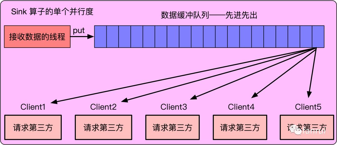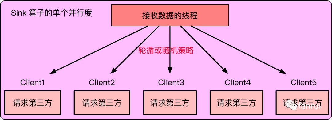 Sink 算子的单个并行度内现在有 5 个 Client 用于消费数据,但 Sink 算子的数据都来自于上游算子。如下图所示,一个简单的实现方式是 Sink 算子接收到上游数据后通过轮循或随机的策略将数据分发给 5 个 Client 线程。