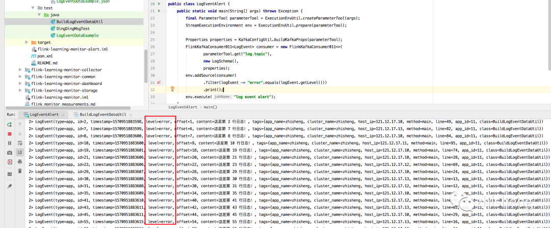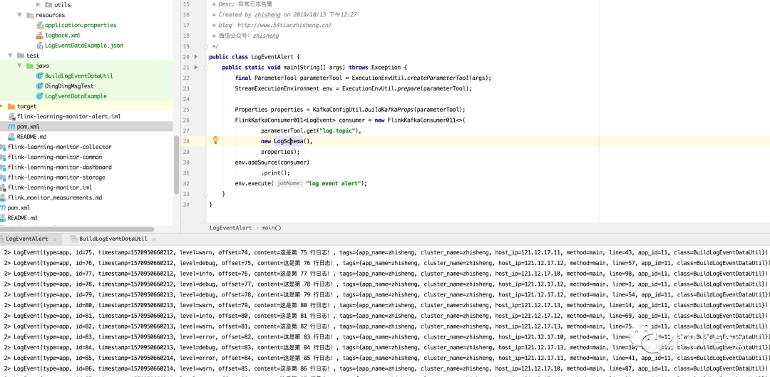 接下来先启动 Kafka,然后运行 BuildLogEventDataUtil 工具类,往 Kafka 中发送模拟的日志数据,接下来运行 LogEventAlert 类,去消费将 Kafka 中的数据做一个验证,运行结果如下图所示,可以发现有日志数据打印出来了。