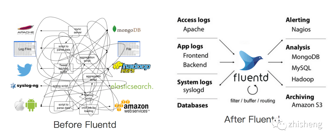 优势:和多数 Logstash 插件一样,Fluentd 插件是用 Ruby 语言开发的非常易于编写维护。所以它数量很多,几乎所有的源和目标存储都有插件(各个插件的成熟度也不太一样)。这也意味这可以用 Fluentd 来串联所有的东西。