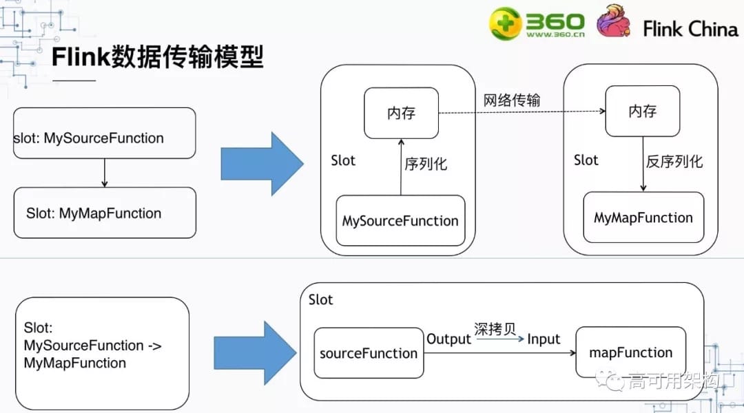 对于Chain起来的两个算子,他们被放到同一个Task中,那么这两个算子之间的数据传输则是:SourceFunction取到数据后,进行一次深拷贝,然后MapFunction把深拷贝出来的这个对象作为输入数据。