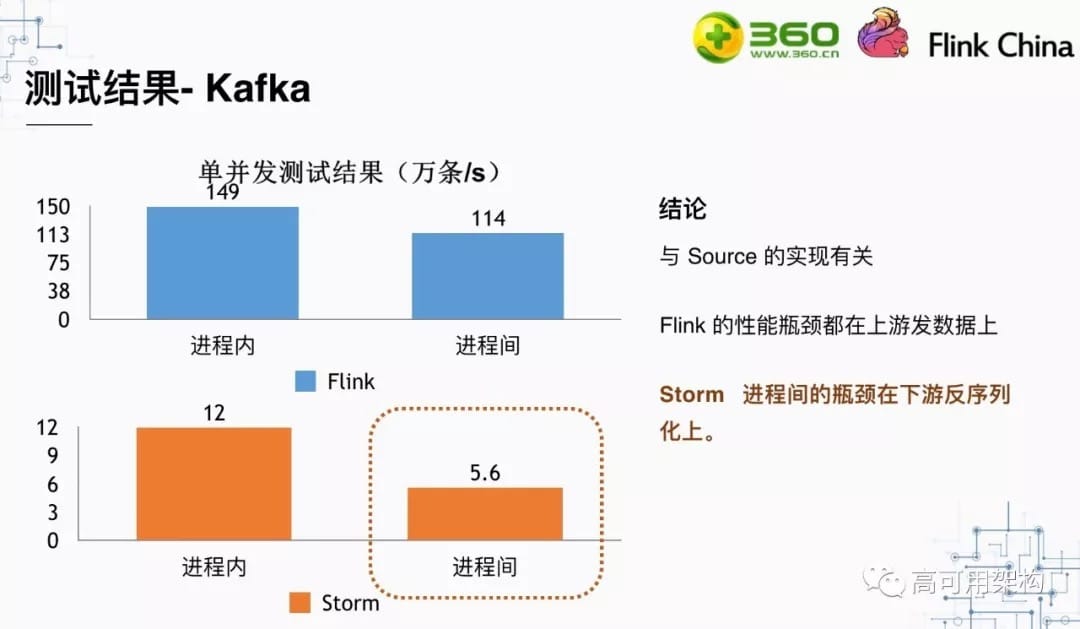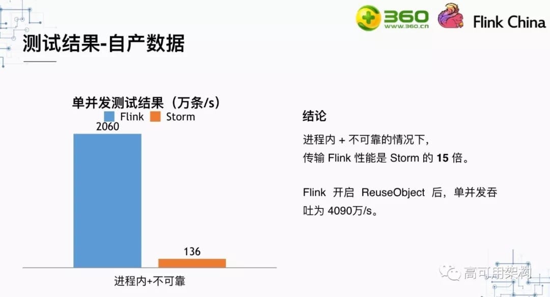 最后一组自产数据的测试结果对比是Flink与Storm在进程间的数据传输的对比,可以看到进程间数据传输的情况下,Flink但并发吞吐是Storm的4.7倍。保证可靠性的情况下,是Storm的14倍。