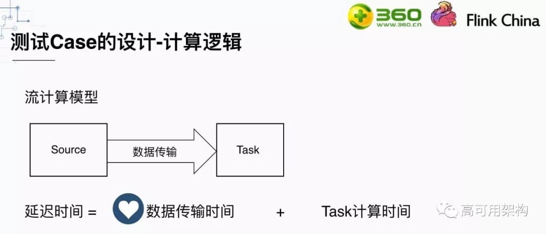 在我们设计计算逻辑时,首先考虑一下流处理的计算模型。上图是一个简单的流计算模型,在Source中将数据取出,发往下游Task,并在Task中进行处理,最后输出。对于这样的一个计算模型,延迟时间由三部分组成:数据传输时间、Task计算时间和数据排队时间。我们假设资源足够,数据不用排队。则延迟时间就只由数据传输时间和Task计算时间组成。而在Task中处理所需要的时间与用户的逻辑息息相关,所以对于一个计算平台来说,数据传输的时间才更能反映这个计算平台的能力。因此,我们在设计测试Case时,为了更好的体现出数据传输的能力,Task中没有设计任何计算逻辑。