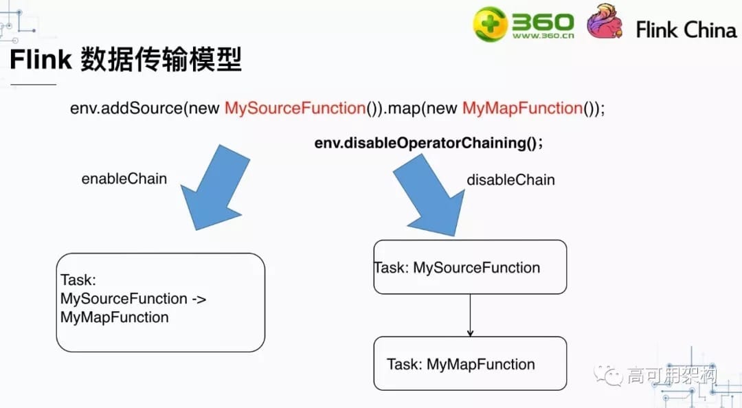大家知道我们在Flink代码时一定会创建一个env,调用env的disableOperatorChainning()方法会使得所有的算子都无法chain起来。我们一般是在debug的时候回调用这个方法,方便调试问题。