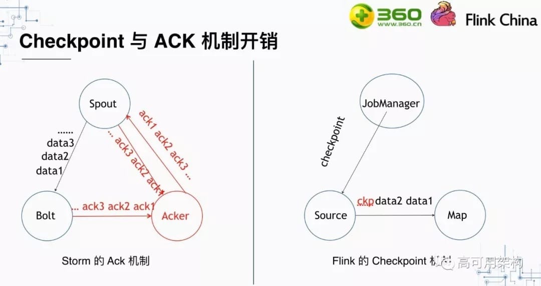 Storm和Flink都有各自的可靠性机制。在Storm中,使用ACK机制来保证数据的可靠性。而在Flink中是通过checkpoint机制来保证的,这是来源于chandy-lamport算法。
