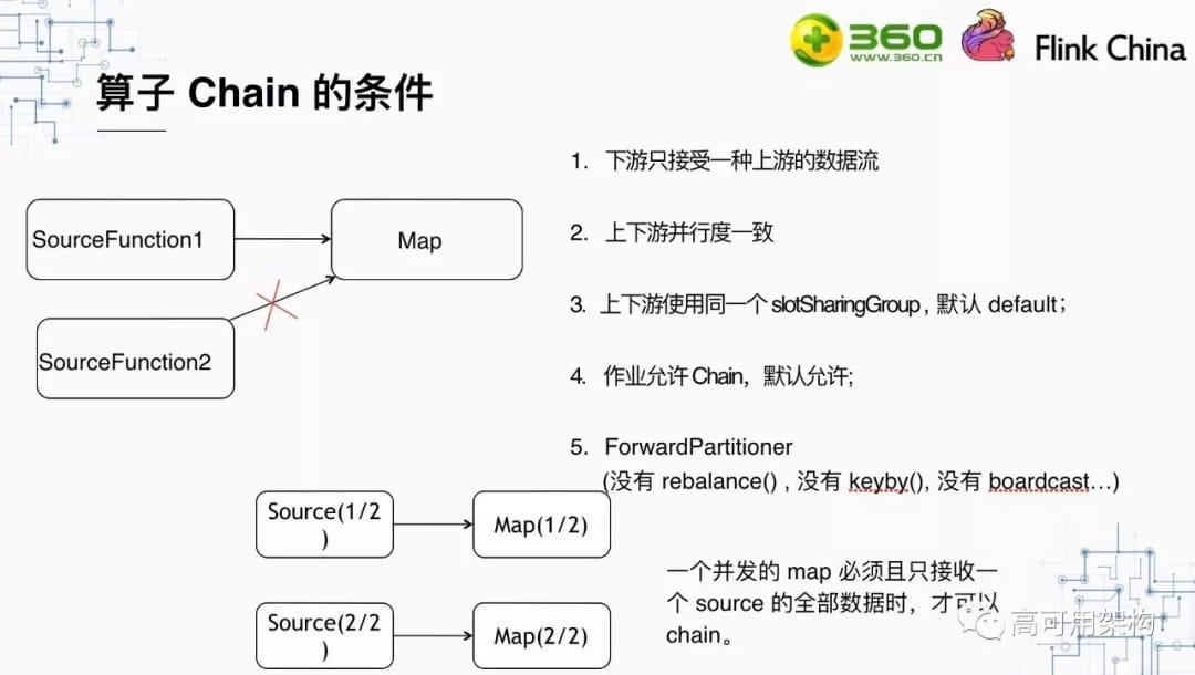 不是任何两个算子都可以Chain起来的,要把算子Chain起来有很多条件:第一,下游算子只能接受一种上游数据流,比如Map接受的流不能是一条union后的流;其次上下游的并发数一定要一样;第三,算子要使用同一个资源Group,默认是一致的,都是default;第四,就是之前说的env中不能调用disableOperatorChainning()方法,最后,上游发送数据的方法是Forward的,比如,开发时没有调用rebalance()方法,没有keyby(),没有boardcast等。